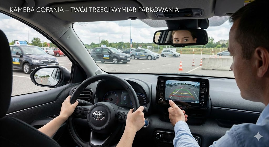 Kamera cofania w samochodach OSK Wojtek (Toyota Yaris, Skoda Fabia) jest po to, abyś uczył się nowoczesnej jazdy. Traktuj ją jako precyzyjny celownik, którego używasz w ostatniej fazie parkowania.